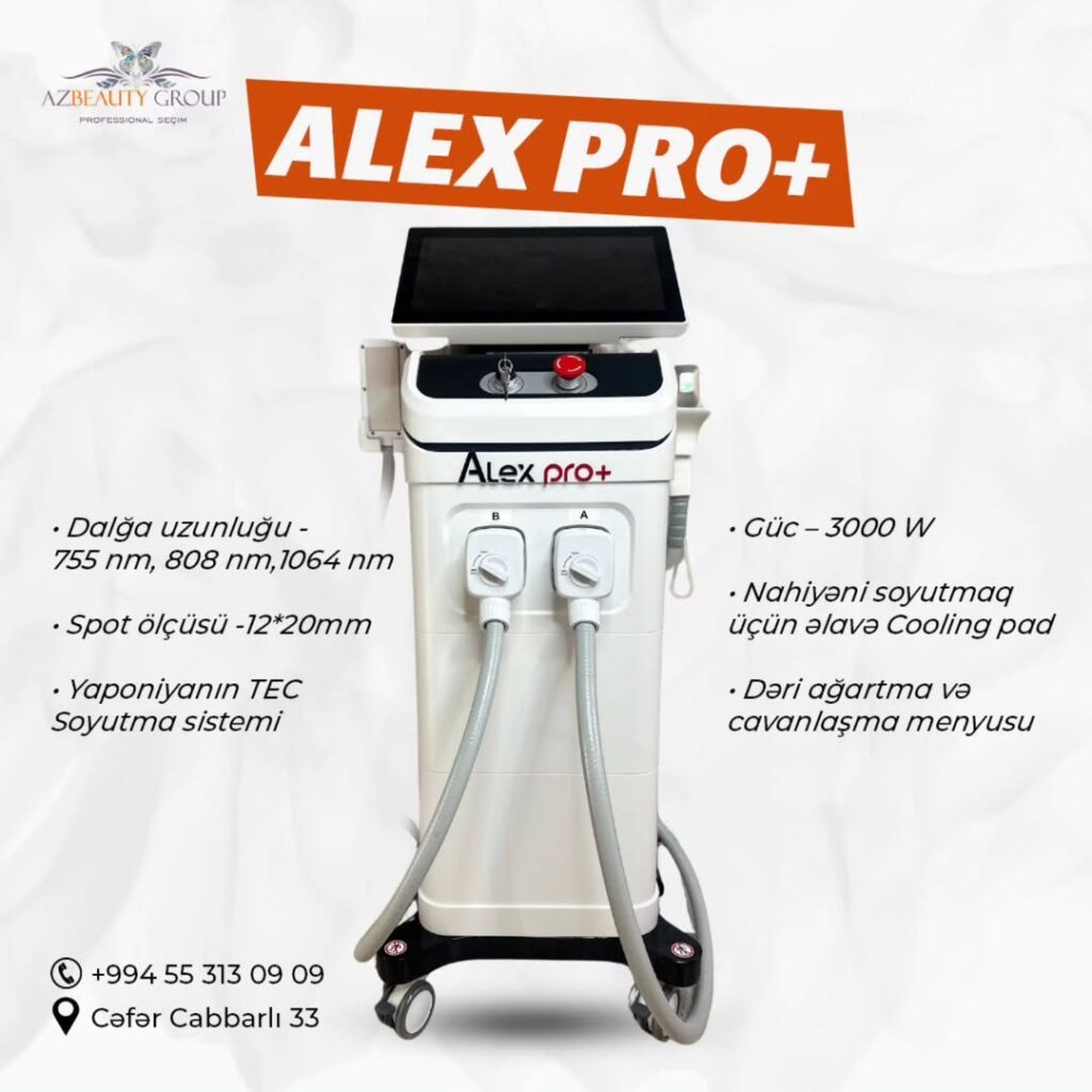 Alex Pro+ Əsas üstünlükləri:-Dalğa uzunluğu:755 nm, 808 nm,1064 nm-Spot ölçüsü -12*20mm-Yaponiyanın TEC Soyutma sistemi-Güc – 3000 W-Nahiyəni soyutmaq üçün əlavə Cooling pad-Dəri ağartma və cavanlaşma menyusu