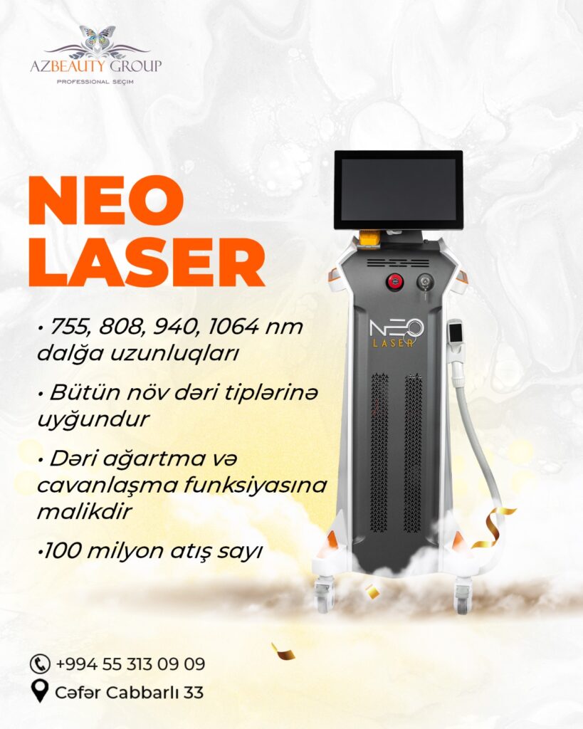İnnovativ Non-crystal texnologiyasına malik olan Neo Laser cihazı fokuslanmış, dərin, anında tükləri məsafədən məhv edən sürətli epilyasiya həyata keçirir. Dərinin dermal qatına lokal olaraq yalnız tük soğanağına təsir edərək, tük köklərini məhv edir. Eyni zamanda sapfir soyutma başlıq ətraf toxumaları soyudur ki, bu da prosedurun tam ağrısız və komfortlu olmasına səbəb olur. 808nm Diod lazer arzuolunmaz tükləri təmizləmək üçün ən son texnologiyadır, hər dəri tipi üçün uyğundur.